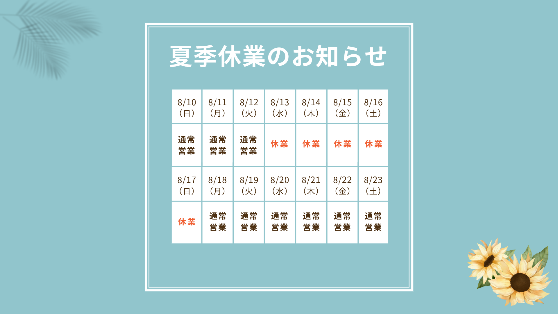 平素は格別のご愛顧を賜り、誠にありがとうございます。 弊社では勝手ながら、夏季休業のため、下記の通り休業させていただきます。 お客様、お取引先様には大変ご不便をおかけいたしますが、何卒ご了承くださいますようお願い申し上げます。